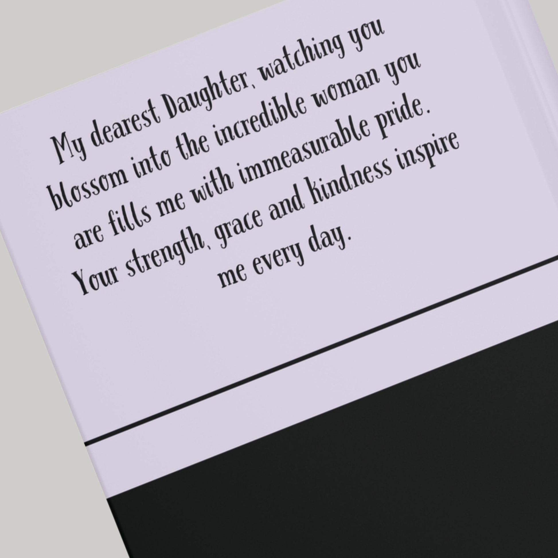 This special journal "To My Daughter- Proud To Be Your Mom" is a wonderful personalized gift for your daughter. Whether it's her birthday, wedding or graduation, this journal is the perfect choice. With a heartfelt quote on the back, it's a perfect way to show your daughter how much she means to you. Give it to her as a blank journal or write letters to her for a keepsake memory book. A memorable gift she will treasure forever!