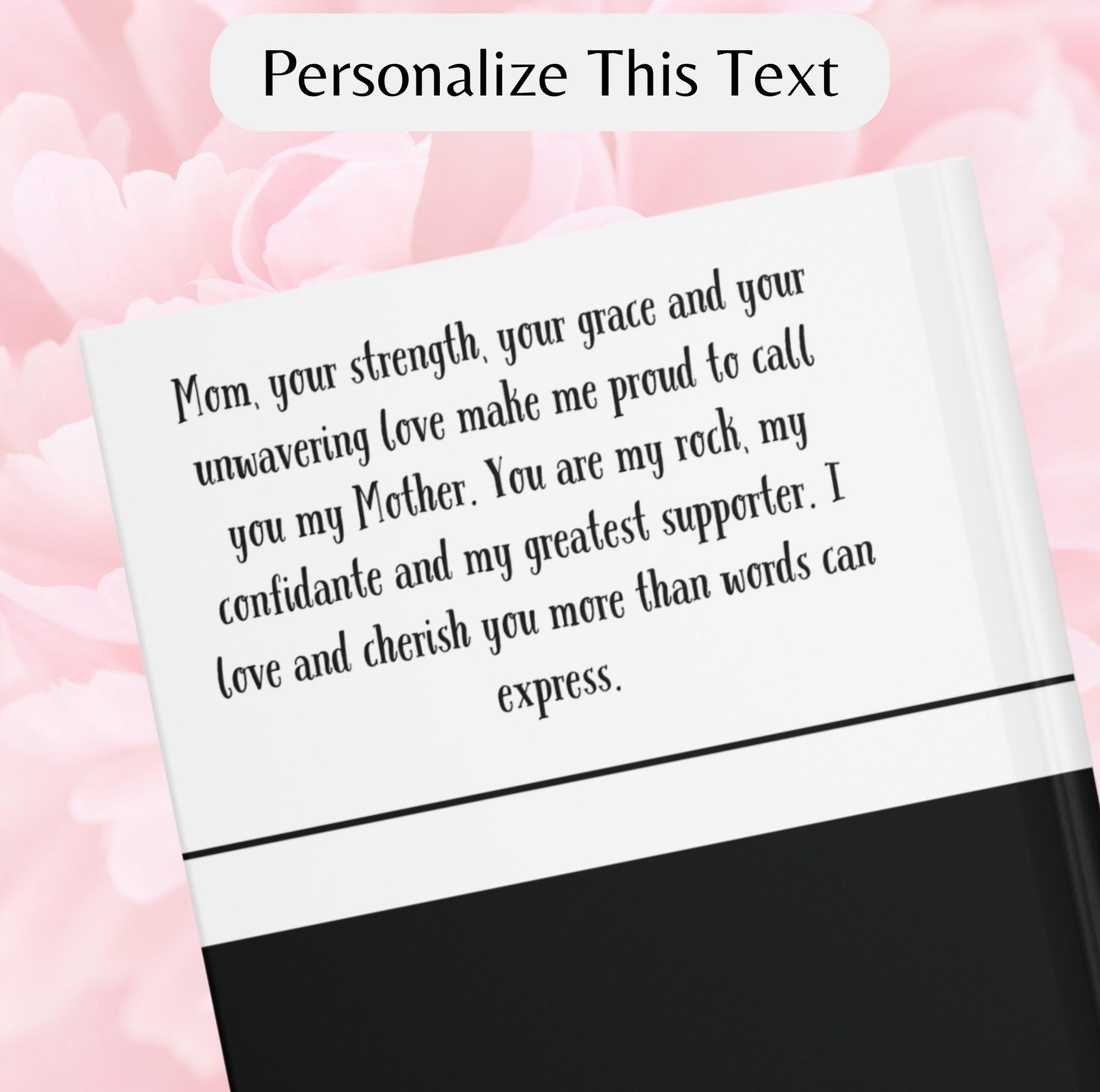 This special journal "To My Mom- Proud To Be Your Daughter" is a wonderful personalized gift for your Mom. Whether it's for her Birthday, Mother's Day, Christmas, Retirement, Just Because or any other Special Occasion, this premium hardcover notebook is the perfect choice. Personalize it with the words on the back to let your Mom know just how much she means to you. Give it to her as a blank journal or use it as a Letters To My Mom journal to write letters to her for a keepsake memory book. Fill it with special memories, heartfelt letters, encouraging words, positive thoughts and wishes. You can also have your children join in to create a special gift for their grandmother. A memorable gift she will treasure forever!